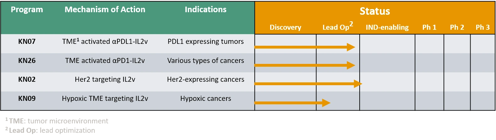 as αPD1-IL2v (KN26) and αPDL1-IL2v (KN07), have exhibited enhanced efficacy compared to conventional immune checkpoint inhibitors in murine orthotopic models of lung and pancreatic cancer. In addition to immune checkpoints PD1 and PDL1, KINE's KN02 and KN09 specifically enhance anticancer immunity by targeting Her2-expressing tumors and the hypoxic tumor microenvironment, respectively.
