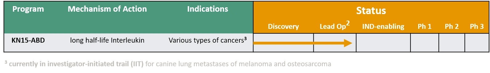 KINE Biotech has developed a proprietary IL15-ABD fusion protein that combines the potent immune-activating properties of interleukin-15 with an albumin-binding domain (ABD) to significantly extend its half-life and systemic exposure. This extended-duration cytokine has shown strong antitumor efficacy in multiple murine models, including orthotopic liver and pancreatic cancers, by promoting the expansion and activation of CD8+ T cells and NK cells. The IL15-ABD fusion is currently under evaluation in an investigator-initiated trial (IIT) in Taiwan for treating canine lung metastases of melanoma and osteosarcoma, offering translational insights into its potential as a novel immunotherapy for aggressive and metastatic cancers.